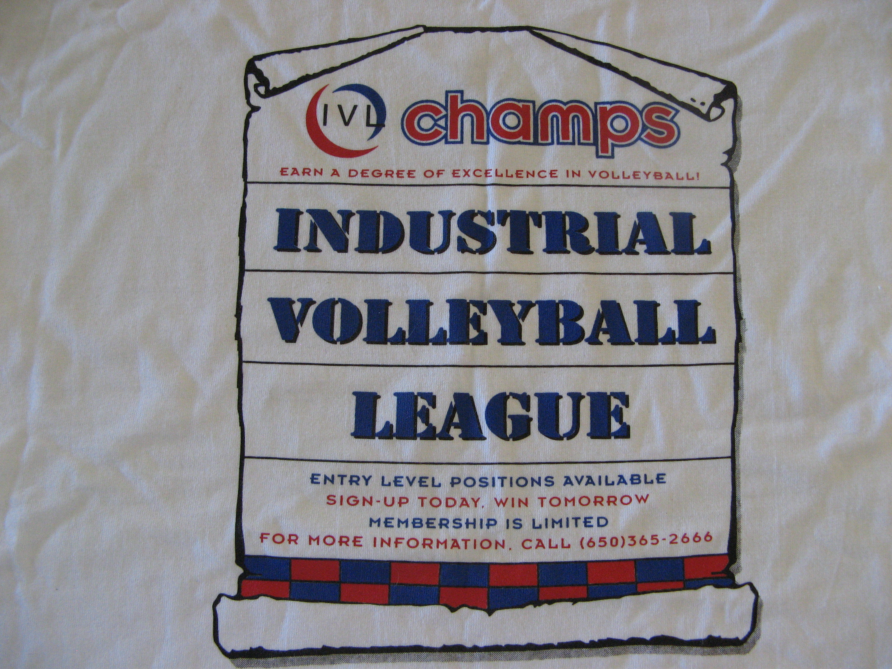 The original prize shirts for the IVL playoff winners each season during the years 1979-2005 were provided by David Hirose of Just Volleyball. David did most of the design concept and sketches, Glen Marchant the graphic design artwork and Chris Snowbarger the t-shirt screen printing. These guys did some nice work.